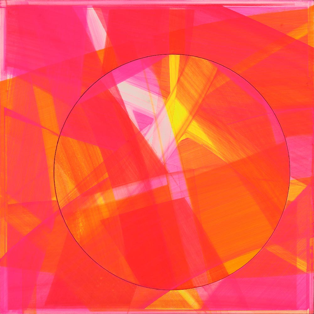 The series of the pi-paintings from Marius D. Kettler. These are abstract paintings that are divided into two sections. The outer section is square, while the central circle is a circular shape that can be moved, enabling the arrangement and modification of a single motif in a variety of ways. This option results in the formation of new constellations of the motif, abstraction in motion, as certain areas of the painting are characterized by the way in which forms fit together and correspond with one another. One painting that can function as a film within your mind.